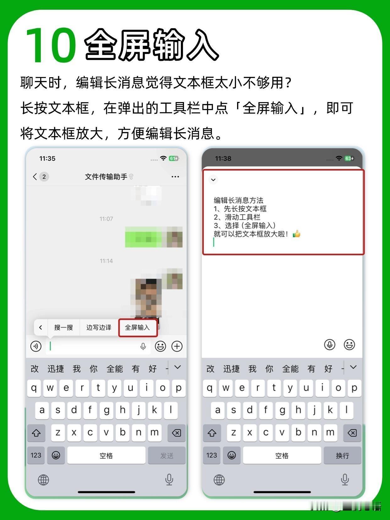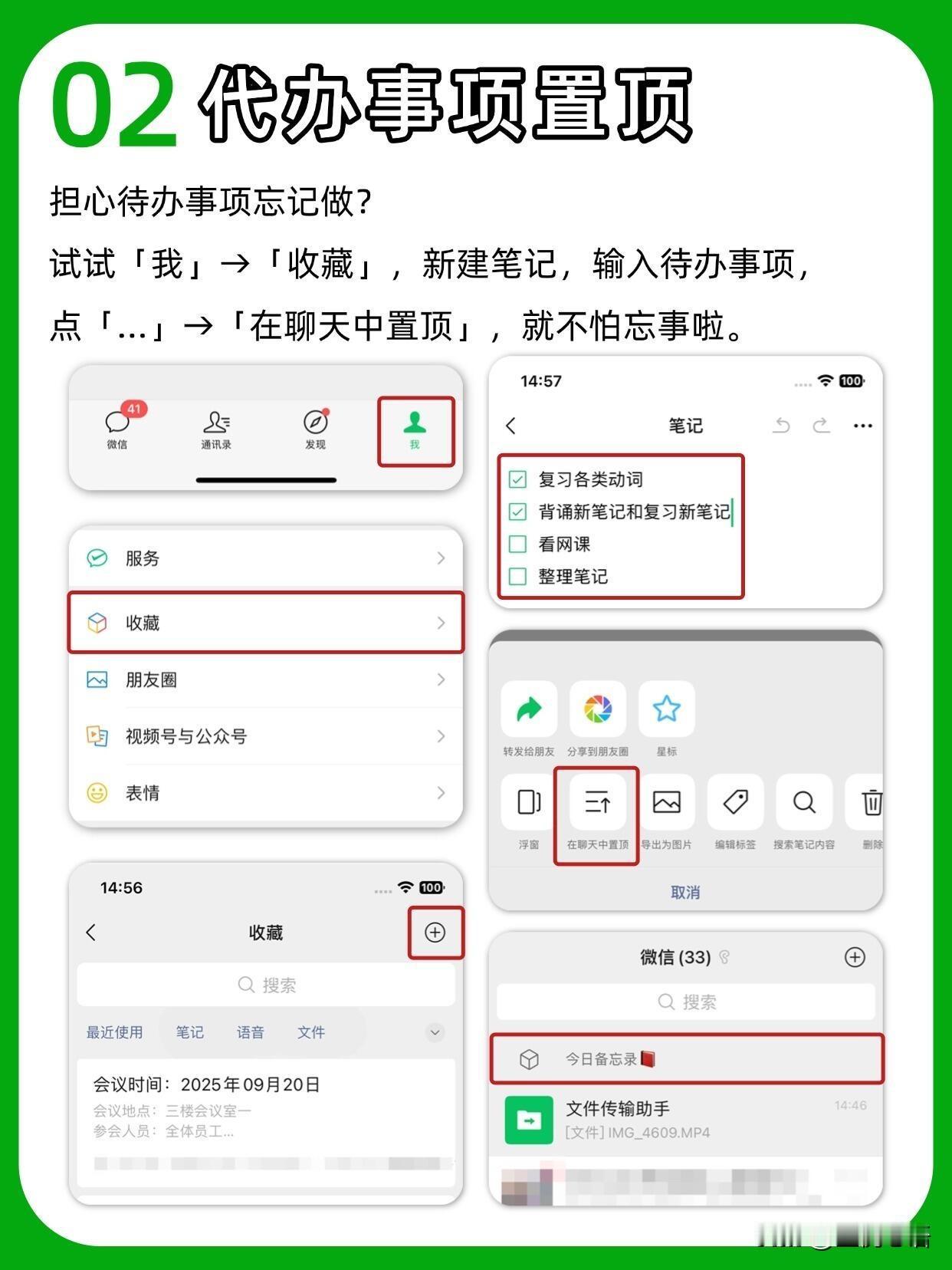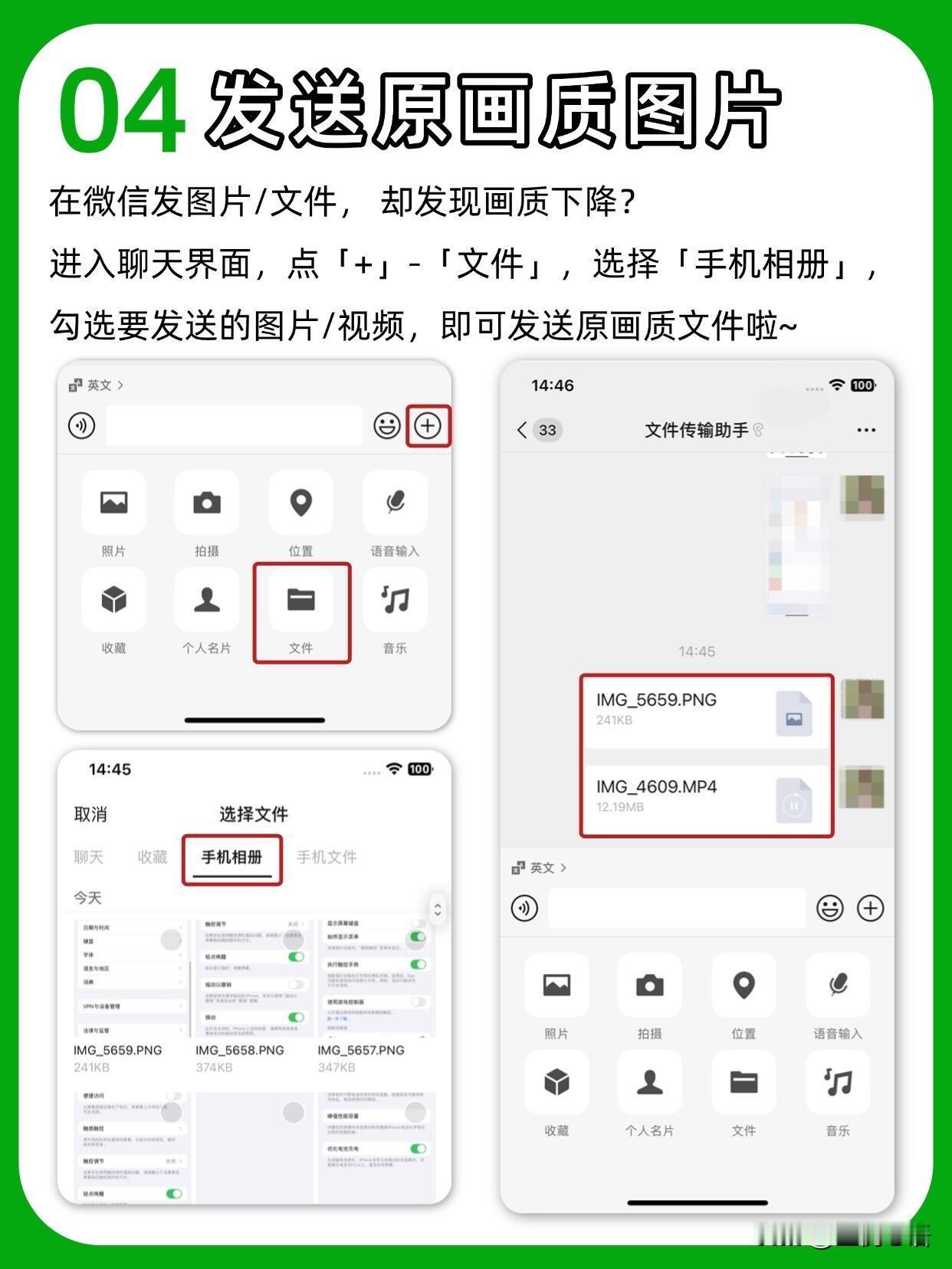你真的会用微信吗? 天天用微信居然藏着这么多神仙功能😭 以前白瞎了多少时间! 误删聊天记录别慌! 设置→帮助与反馈→扳手图标→故障修复, 说不定就能找回来,亲测有用! 待办事项记收藏里, 再设个聊天置顶, 比备忘录还省心,再也不会忘事啦~ 开会不用狂写笔记, 收藏里开语音输入, 直接转文字,效率直接拉满! 发图再也不用忍模糊画质, 聊天框点+选文件, 从手机相册选图,原图发送超清晰! 还有一键拼图、图片提取文字, 不用再装额外App,微信里全搞定! 找不到的群聊, 点右上角+→发起群聊→选择一个群, 就能全部看到~ 长按文本框有惊喜! 全屏输入写长消息超爽, 边写边译和外国朋友聊天无压力~ 这些隐藏技巧真的太实用了, 每个都能让我们省出好多时间!