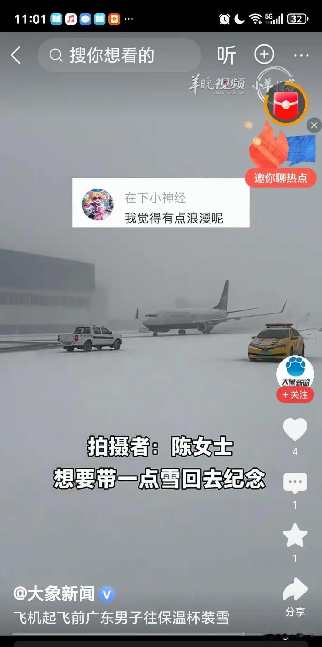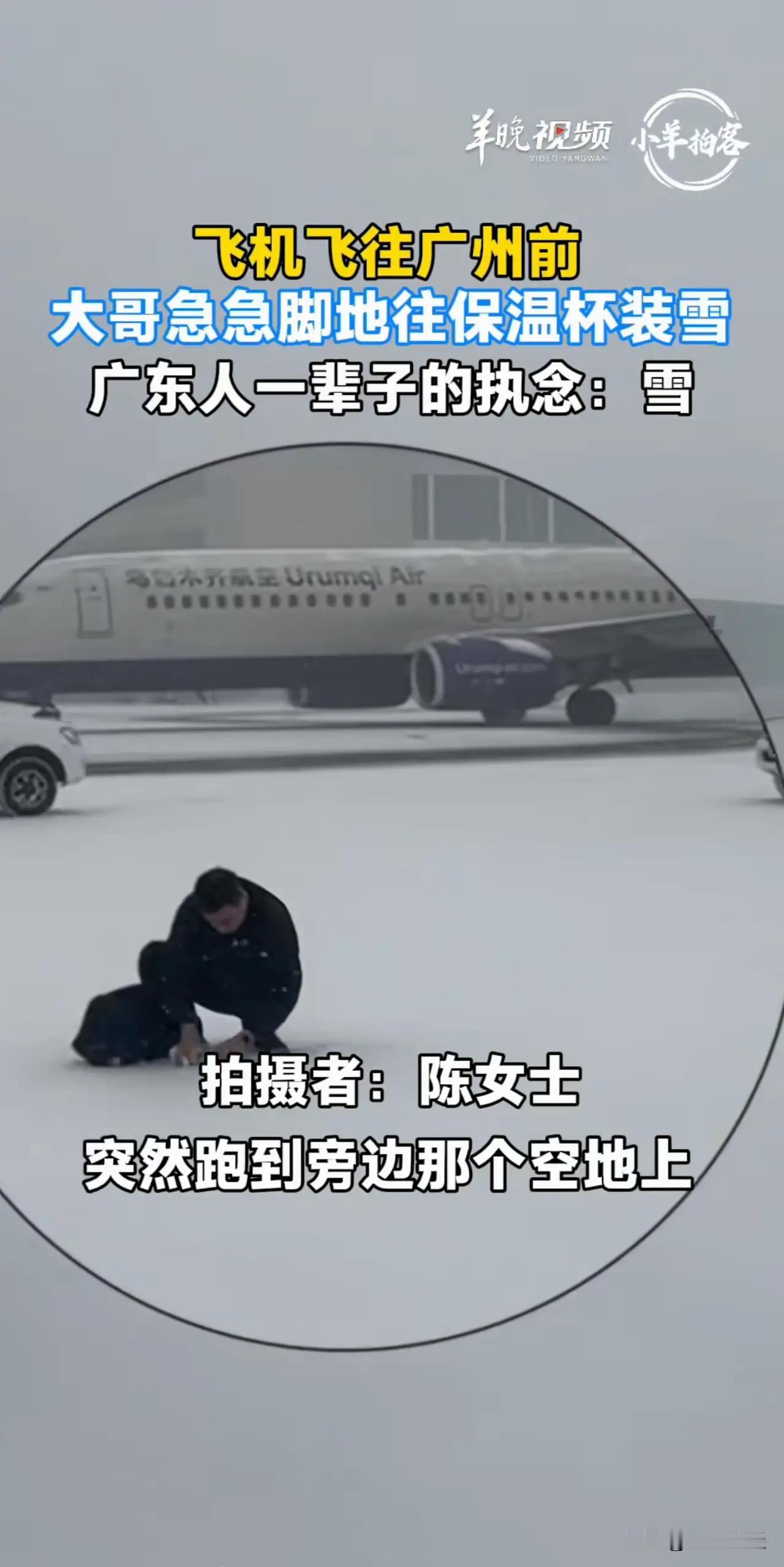 广东人对雪的执念——一广东男子在乌鲁木齐飞广州的飞机起飞前,用保温杯装了一瓶雪,带回广州! 北方人可能不理解,很多广东人是真的没有见过雪。尤其珠三角,粤西等居民可能一辈子都看不到雪,也就粤北,粤东山区会下雪。 广州最近几十年年来,唯一一次下雪还是十年前的2016年,2016年春节期间,广州下了差不多半小时的小到中雪,当然了,雪下到地上立马就融化了,因为地面温度大于零度。 这还不算什么,广东人对雪的执念,远远不止于此。你能想象吗?一位广东男子在乌鲁木齐的机场,竟然用保温杯装了一瓶雪,准备带回广州!这个画面,既搞笑又感人,折射出广东人对雪那份特殊的情感。 在南方的土地上,雪几乎是一种奢侈品,一种遥不可及的梦。很多广东人一辈子都没见过真正的雪景,更别说亲身体验那片白茫茫的世界。于是,每当北方飘雪时,朋友圈里总会有人发出羡慕甚至是“酸酸”的评论:“我都没见过雪啊!”这份渴望,仿佛变成了一种对童年、对远方、对未知的向往。 而这位男子的举动,无疑点燃了许多人的共鸣。或许,他只是想用一瓶“来自北方的雪”来满足自己心中那份渴望,或许,他只是想用这份“冷”的记忆,温暖广州那片热情的土地。有人说,这是一种“执念”,但我更愿意看作是一种对美好事物的追寻,是一种对生活细节的珍惜和热爱。 广东人对雪的执念,折射出的是一种对未知的渴望和对美好事物的追求。我们或许习惯了阳光、热浪,但内心深处,那份对雪的向往从未消逝。它代表着纯净、纯粹,也代表着一种生活中难得的惊喜和感动。 这不禁让人反思:在快节奏的生活中,我们是否也像那位带雪回广州的男子一样,心怀一份“执念”,去追寻那些看似遥不可及的美好?或许,生活的意义,就在于不断追逐那些让你心跳加速的瞬间。无论是雪花飘落的瞬间,还是那一瓶用心装载的雪,都提醒我们:生活中最珍贵的,往往是那些简单而纯粹的感动。 所以,下次当你看到朋友圈里有人晒雪,别只觉得羡慕。或许,那也是一种对生活的热爱,一种对美好事物的执着追求。毕竟,每个人心中,都藏着一片属于自己的雪白世界,只等着我们去发现,去珍藏,去用心感受。广东看雪 南方人初雪体验