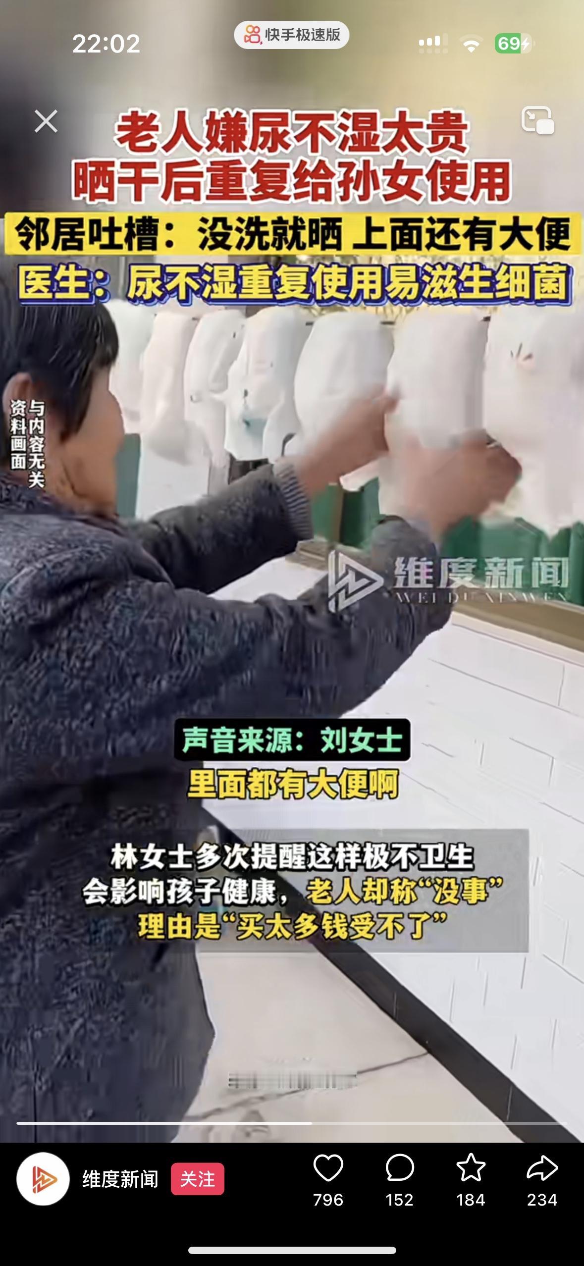太恶心了!真是刷新了我的三观 福建一小区的一位老人为了省钱,把才2周大的孙女用过的还有屎的尿不湿,直接晒干2次利用,洗都不洗,上面的大便痕迹还清晰可见。 好心的邻居提醒她这样不好对孩子,她却说没事,买太多钱受不了了 尿不湿本来就是一次性用品,吸水层一旦被污染,晒干根本无法杀灭细菌。重复使用还可能导致孩子尿路感染,皮肤溃烂。省下这点钱,还不够给孩子看病的呢,哪里是疼孩子,这就是在坑孩子,到底是糊涂还是自私?