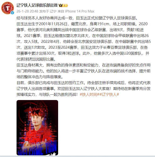 辽宁铁人队再引新援,刚刚辽宁铁人队官宣田玉达加盟。 田玉达出生于2001年11月26日,籍贯北京,身高191cm,体重85kg,场上司职中锋(前锋)。 田玉达出自山东鲁能青训体系,多次入选中国U15至U21国字号梯队,并曾试训法乙欧塞尔俱乐部。 之前曾在北京国安和长春亚泰队效力,作为一个年轻的高大中锋,田玉达的加盟可以丰富辽宁铁人队前锋线进攻层次。 就在刚刚辽宁铁人队与韩国球队庆州水利热身赛,田玉达在最后时刻头球打进扳平一球,体现了他的价值。
