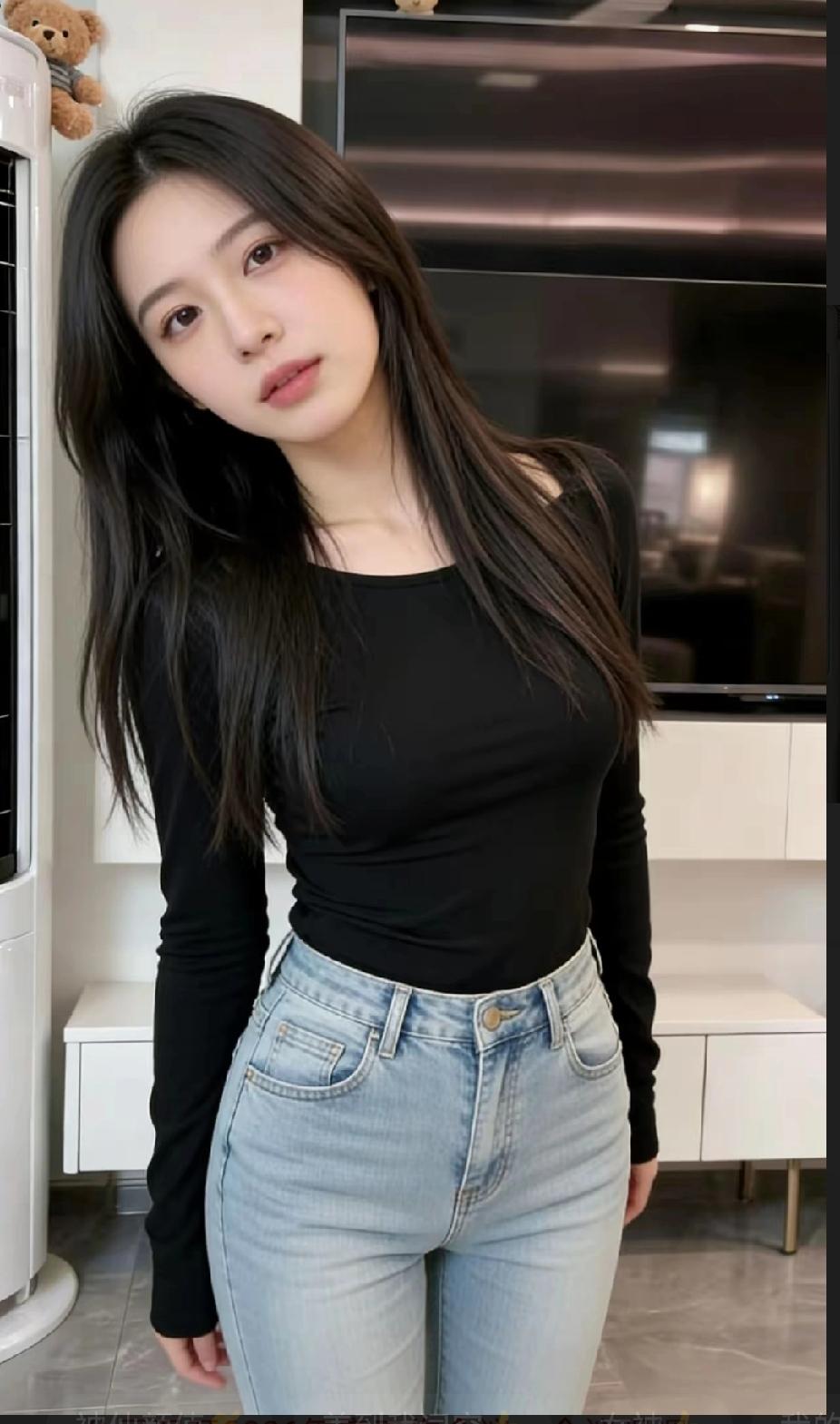简约穿搭,黑色上衣配牛仔裤,清新自然!