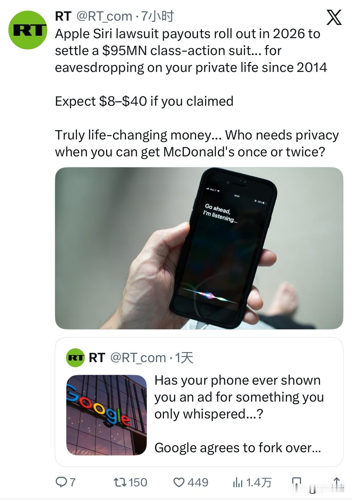 苹果公司Siri窃听用户隐私诉讼案将于2026年支付9500万美元赔偿金,以了结一项集体诉讼……该诉讼指控苹果自2014年以来一直在窃听用户的隐私。 如果您申报,预计可获得 8 至 40 美元。 根据 2026 年 1 月的最新进展,苹果公司已开始向符合条件的美国用户发放总额为 9500 万美元 的集体诉讼和解金。 这起名为 Lopez v. Apple Inc. 的案件主要涉及以下内容: 起诉事由:原告指控苹果的语音助手 Siri 在未经用户同意的情况下,通过“非预期激活”录制私密对话,并将部分录音分享给第三方(如广告商或承包商)进行人工审核。 和解详情:尽管苹果否认了所有不当指控并坚称 Siri 旨在保护隐私,但最终于 2025 年初达成和解协议,以避免长期诉讼带来的成本。 赔付进度: 发放时间:赔付款项已于 2026 年 1 月 23 日(星期五)左右开始陆续打入用户账户。 到账金额:最初预计每台设备最高赔付 20 美元,但由于索赔人数众多,目前用户收到的实际金额约为 每台设备 8.02 美元。 到账标识:银行账单或支付工具(如 Venmo、PayPal)中通常会显示为 "Lopez Voice Assistant" 或 "Lopez Voice Asst-Payouts"。 适用人群:在 2014 年 9 月 17 日至 2024 年 12 月 31 日 期间购买过支持 Siri 的设备(iPhone、iPad、Mac 等),且曾经历过 Siri 意外启动的美国居民,并已在 2025 年 7 月截止日期前提交索赔申请。 值得注意的是,苹果此前在 2021 年也曾有过一起同样为 9500 万美元的和解案,但该案是针对 AppleCare 翻新更换设备 问题的。
