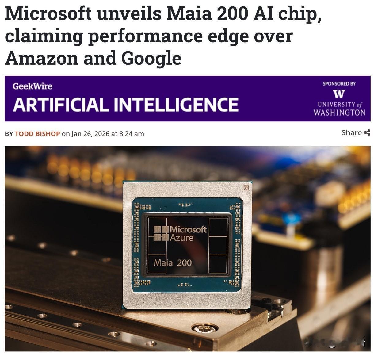 微软发布了 Maia 200,这款人工智能芯片为 GPT-5.2 提供支持。 他们推出了 Maia 200,这是其第二代自主研发的 AI 芯片,采用台积电 3 纳米技术制造。 该芯片专为人工智能推理而设计,包含大容量片上存储器,可加快数据处理速度并提高效率。 微软声称其每美元性能提升了 30%,在某些基准测试中甚至超越了亚马逊 Trainium 和谷歌 TPU。Maia 200 已部署在微软位于爱荷华州的数据中心,为 OpenAI 的 GPT-5.2、Microsoft 365 Copilot 以及微软内部的 AI 项目提供支持,微软还计划在凤凰城进行第二次部署。 凭借 Maia 200,微软直接挑战英伟达的 AI 芯片,从芯片到前沿模型,进一步加强了对其 AI 技术栈的控制。