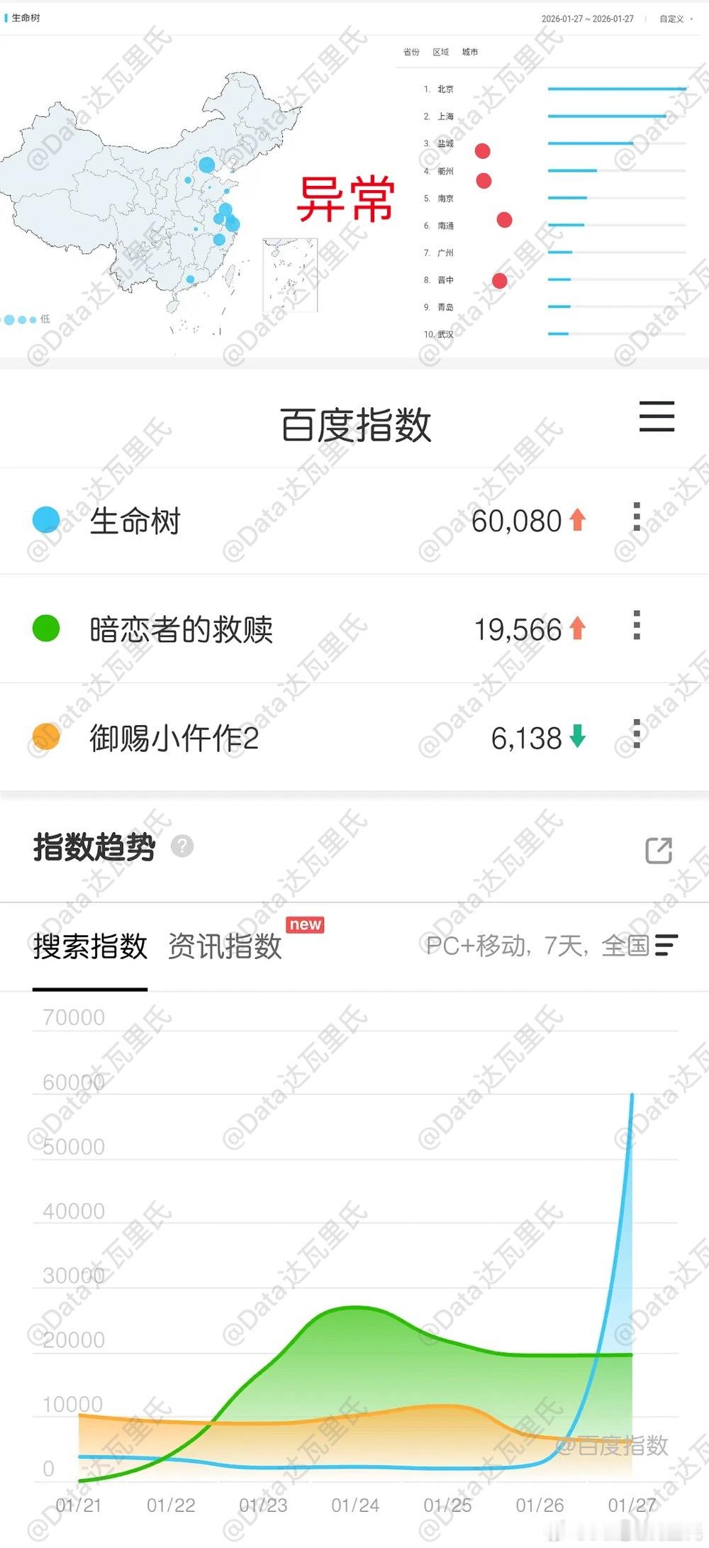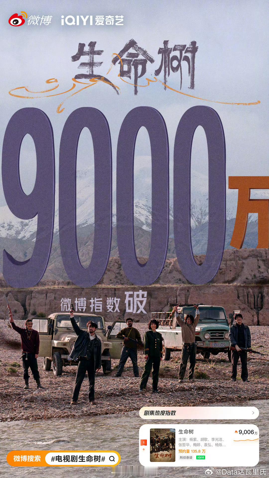 杨紫、胡歌生命树微博指数破9000万开始给数据造势了,微博指数9000万属于实在没得可吹,无奈只有这个可以唬人哈哈哈哈,大家要清楚,日常观察数据的使用的微(信)指数,生命树只有1600万,百指虽然有6w但十城异常(💦)吹不了生命树百指异常 ,生命树数据 ,生命树微博指数破9000万
