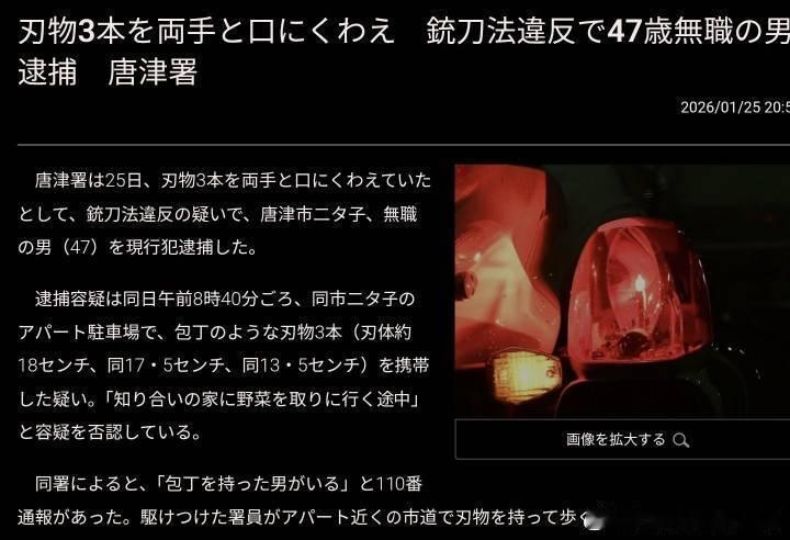 这年头日本新闻也真是够抽象的!1月25日佐贺县唐津市警方接到报警,说是一名男子携带多把刀具正在满大街转悠。警方赶到现场直接好家伙,这人不仅两手各持一把短刀,而且嘴上还叼着一把。最终警方以违反日本枪刀管制法为由当场逮捕持刀男子,此人现年47岁,无固定职业。他表示自己并无伤人意愿,当时只是想去熟人家里取蔬菜罢了。日本媒体专门为这则奇葩新闻做了情景还原动画,持刀男子造型看起来非常难绷。部分日本网友发帖表示:幸亏发现及时,高龄无业了无牵挂正是无敌阶段,随身携带三把短刀绝对是个狠人!还有些乐子人则齐齐发问:索隆,何时来的?这回三刀流惊现街头,真正应该感到庆幸的是那些办案警察,如果此人祭出大招三千世界在场众人顷刻之间就会变成刀下亡魂!离谱事件新星闪光计划魔金石科技