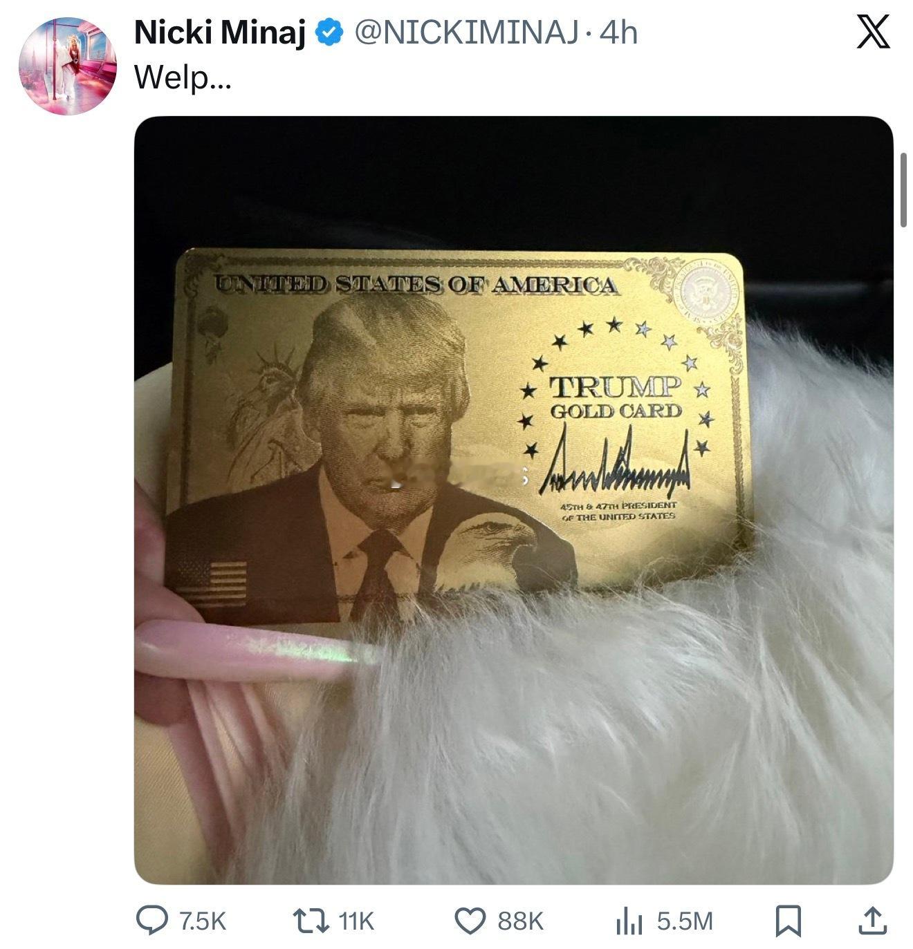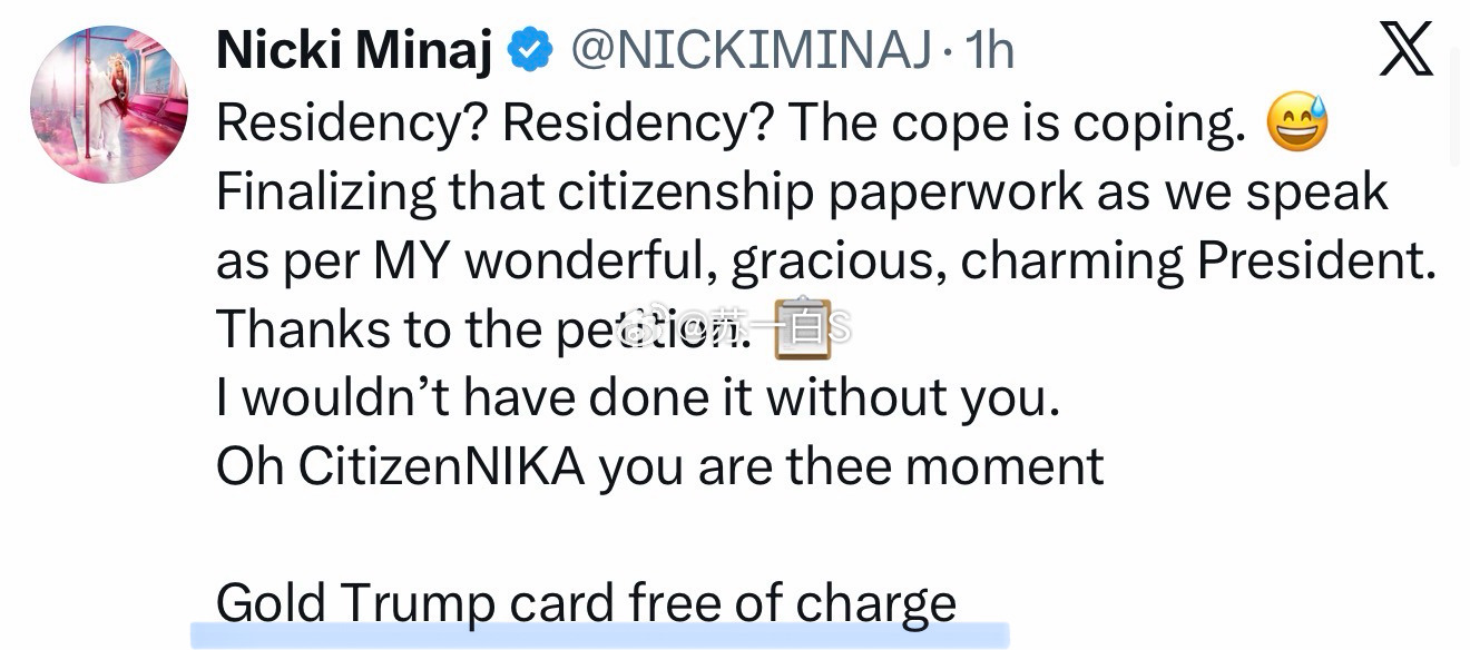 麻辣鸡Nicki Minaj给阿川站台👇说自己是川子的头号粉丝🙉还晒出了一张阿川的金卡,这张卡需要花费100万💲来帮助持卡人快速获得美国公民身份(麻辣鸡2024年曾表示过自己还不是美国公民)不过看麻辣鸡发的图六,她应该是免费获得了此卡她承诺会捐出六位数来支持阿川推出的儿童储蓄计划……