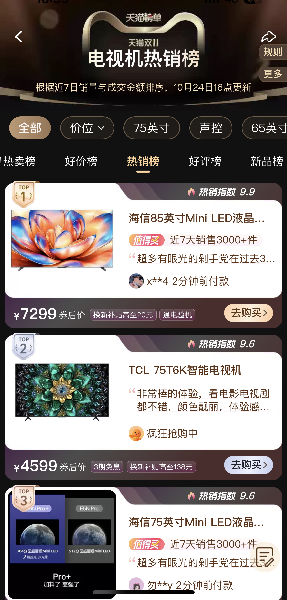 总的来说,海信电视E5N Pro+以其卓越的技术创新和出色的用户体验,赢得了市场的认可和消费者的好评。在今年的在双11购物节期间的电视机热销总榜中,海信电视E5N Pro+占据了TOP3中的两个席位,可谓是实力超群!如果你正在寻找一款能够满足全方位需求的高品质电视,海信电视E5N Pro+无疑是一个理想的选择。