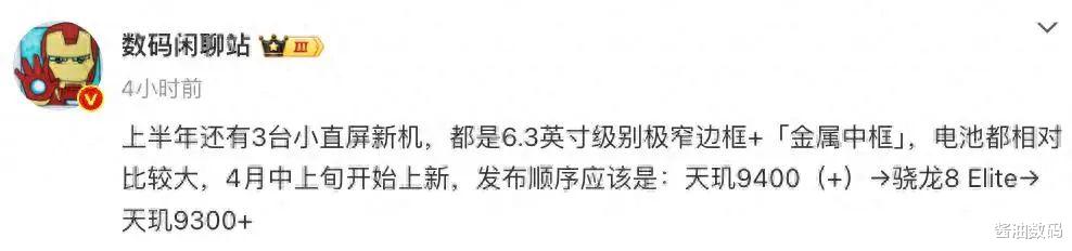 新机将会在4月中上旬开始陆续到来,具体的发布顺序是天玑9400(+)新机→骁龙8 Elite新机→天玑9300+新机。