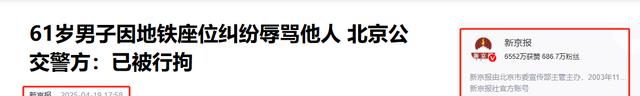 2.原文登载于新京报2025年04月19日关于“61岁男子因地铁座位纠纷辱骂他人北京公交警方:已被行拘”的报道