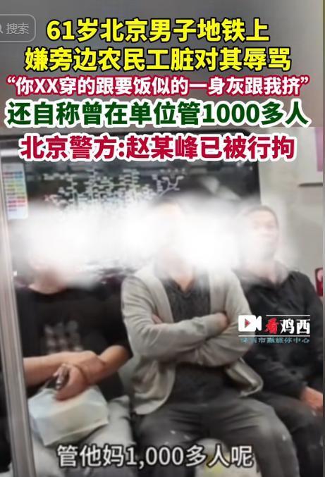 4月17日正值晚高峰,两名农民工大哥结束工地劳作后登上地铁,疲惫的他们选择坐在61岁赵某峰身旁的空位,却因工服上的灰尘成为后者攻击的靶子。