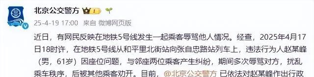 在此背景下,4月19日,北京公交警方通报称,赵某峰因“多次辱骂他人、扰乱乘车秩序”被依法行政拘留。