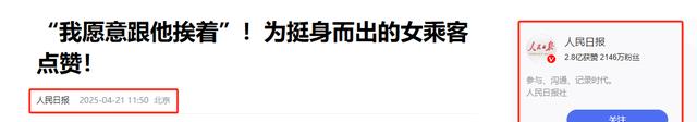 1.原文登载于人民日报2025年04月21日关于“‘我愿意跟他挨着’!为挺身而出的女乘客点赞!”的报道