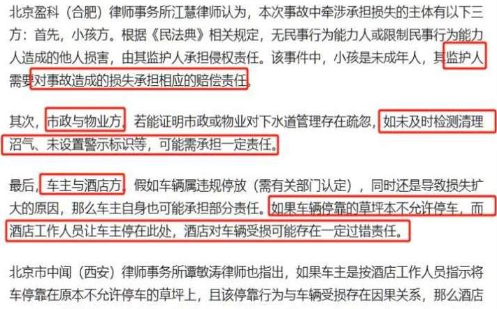 有网友玩笑说,这小男孩从“富二代”瞬间变成了“负二代”。再说说,“小男孩的父母面临580万元的高额赔偿”也是热议话题,连小孩的妈妈还在网路上发了一篇“免责声明”。大致意思就是,这事儿不能全算在小男孩头上,主要责任还是在市政部门、物业、车主、酒店等九个方面的失职。