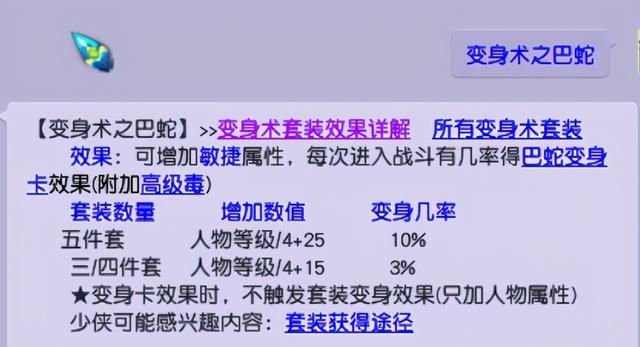 倒是巴蛇套让我真香过几次。有回刷九色鹿下被千年蛇魅毒得蓝条见底,变着巴蛇卡愣是扛了五回合没中招。虽然平时看着没啥存在感,但关键时刻免疫中毒的效果,比普陀山灯都管用。不过要论性价比,还是修罗傀儡妖套实在。虽然必杀对固伤没用,可129级那属性加成是真香,穿身上比戴三条舍利子还顶。
