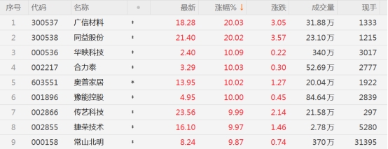 华为产业链:今日华为产业链继续活跃,捷荣技术5连板、广信材料、同益股份20CM涨停,华映科技、合力泰、奥普家居、豫能控股、传艺科技涨停。