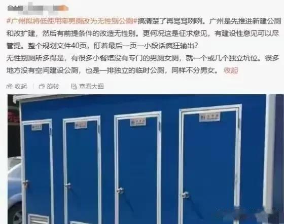 不要把男性公厕改造成无性别公厕说成为了解决女性入厕时间长的问题,这一次真的不背这个锅啊,真的想要好好解决问题,就从实际出发呀,为什么硬要打着这样的幌子呢,看样子LGBT的风还是吹的很猛啊!