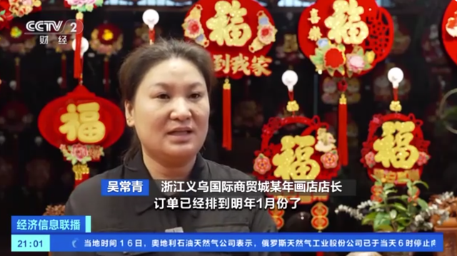 门店负责人介绍:“这些天客户线上、线下的订购热情非常高涨,订单已经排到明年1月份了,总数超过了3000万件,比去年同期增长了10%。”值得一提的是,义乌国际商贸城年画挂历对联经营区是目前国内最大的节庆产品集散中心,全球有80%以上的年画、对联都来自这里。因此,义乌的节庆用品市场不仅在国内享有盛誉,而且在国际市场上也颇具影响力。