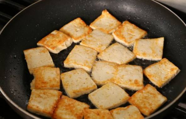 不粘锅加入适量油,将豆腐煎至两面金黄