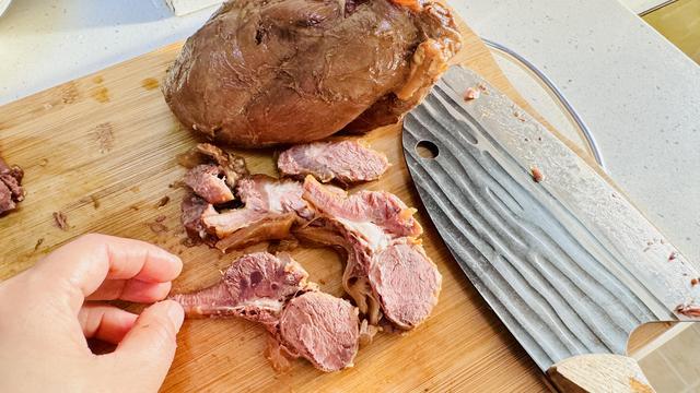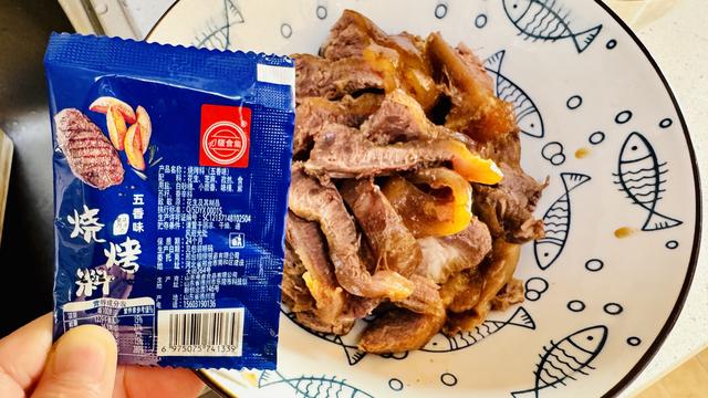 我先切了一块小的,大的那一块我直接放保鲜袋里装起来放冰箱吃的时候再切更佳。切好的卤牛肉可以直接空口吃,也可以用馥食集的烧烤料蘸着吃,还可以凉拌着吃,吃法就根据自己习惯来。反正我个人觉得卤好的牛腱子肉怎么做都好吃!