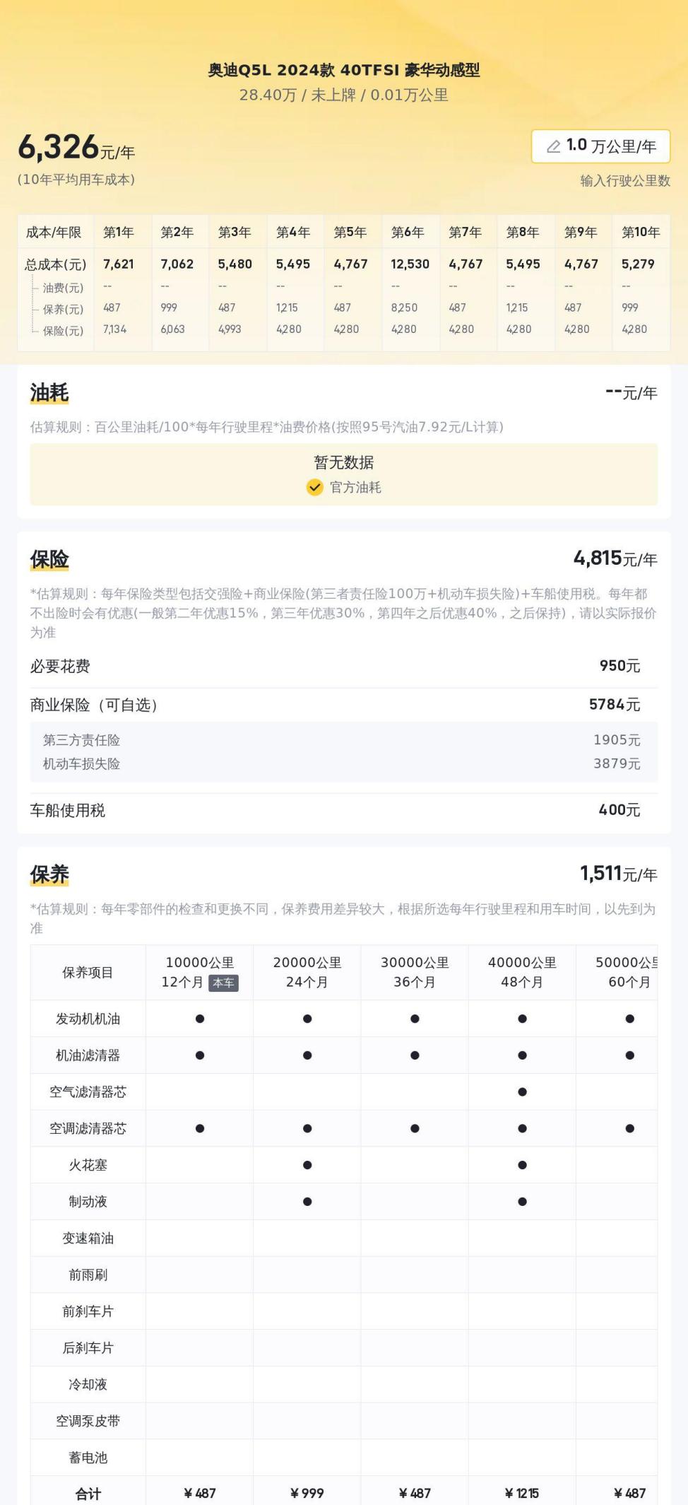 除了车价,后期的用车成本也是需要考虑的重要因素。Q5L作为一款豪华SUV,其保养费用、保险费用、油耗等相对较高。根据一些车主反馈,Q5L的百公里油耗在10L左右,每年的保养费用大概在几千元不等。购买二手车前,需要对这些用车成本做好预估,避免后期出现经济压力。
