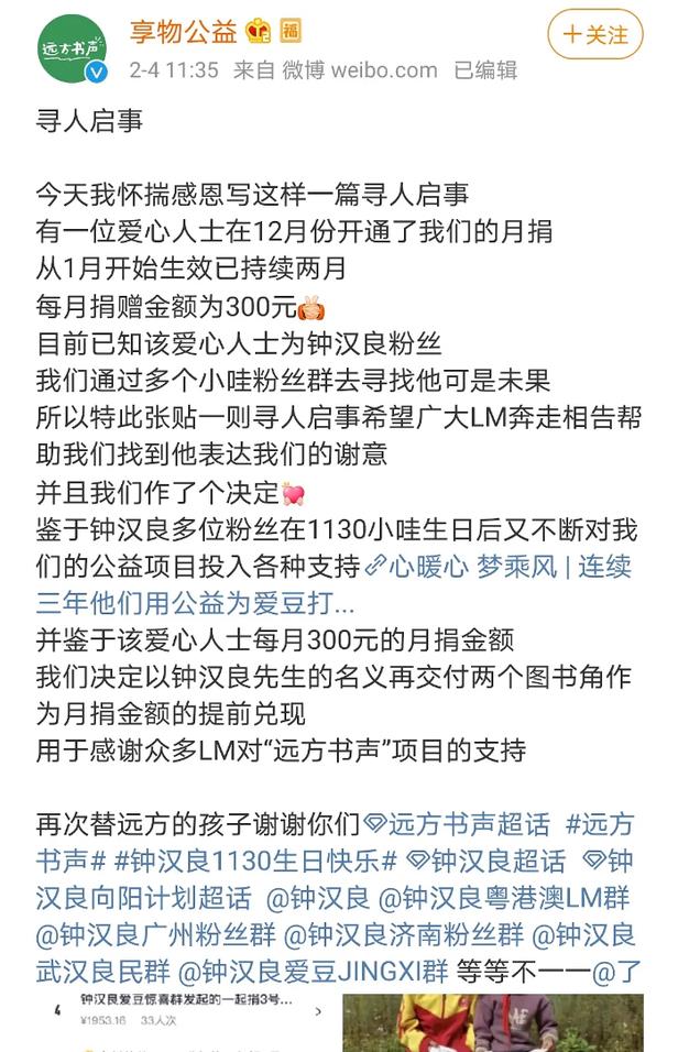 参加各种公益活动和义卖筹款,自发组织了为西北大陆捐助树苗,为偏远地区的孩子寄送礼物,资助爱心耳蜗活动,粉丝资助的图书馆以及奖学金等公益活动。