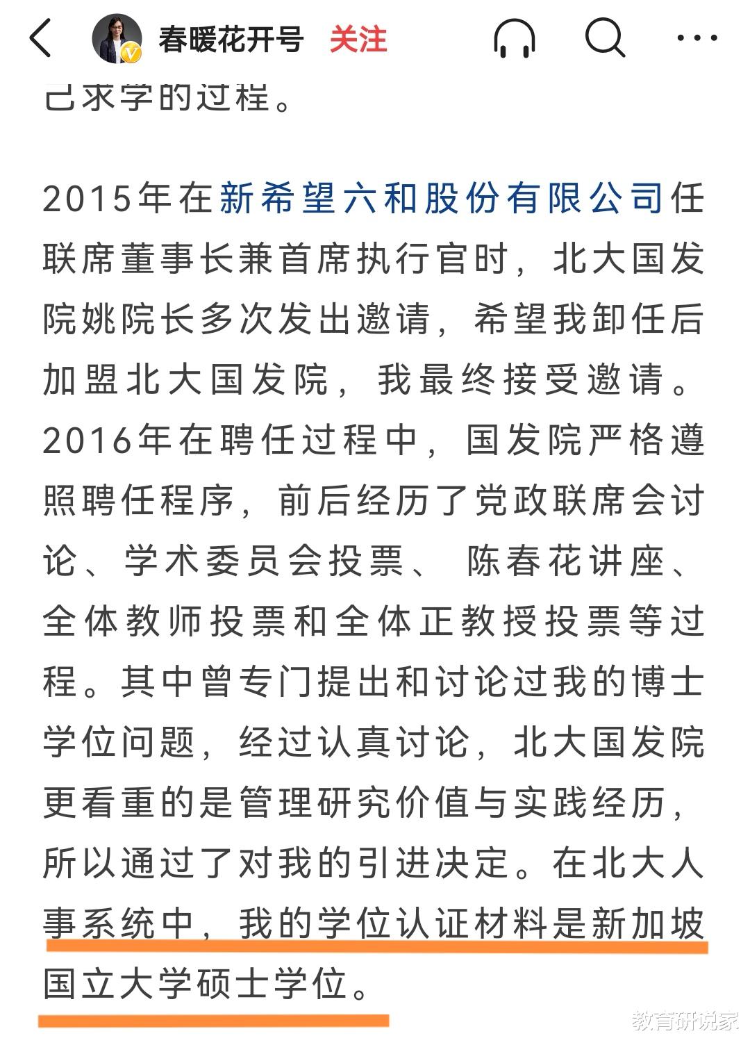 其次就是回应辞职和学位的事情。陈春花教授向北大提交了辞职申请,结果可想而知——自己的北大教授应该是化为乌有了。但是她也提到,以及在入职北大的时候,北大对她的学历认证就是硕士学位。