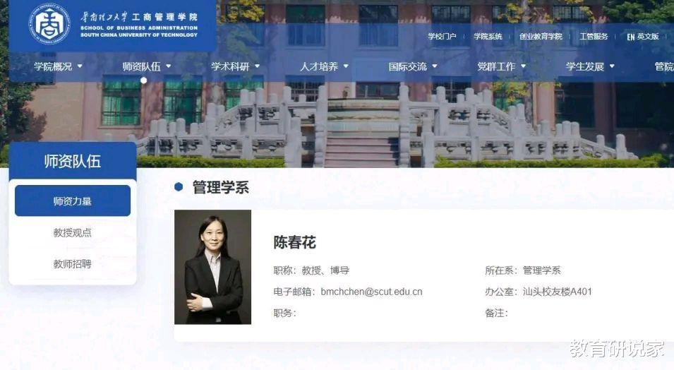 在事情出来之后,华南理工大学也删除掉了关于陈春花教授的教育简历。但要知道,陈春花最先就是华南理工大学的教授和博导。