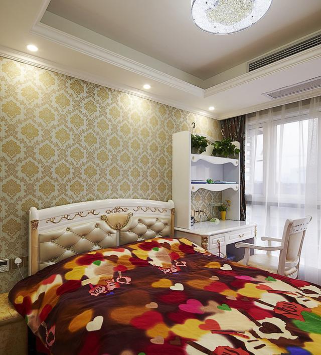 主卧室,装修很温馨,上面做了漂亮的吊顶,还有水晶吊灯,应该很少有人在卧室里装吊灯吧?