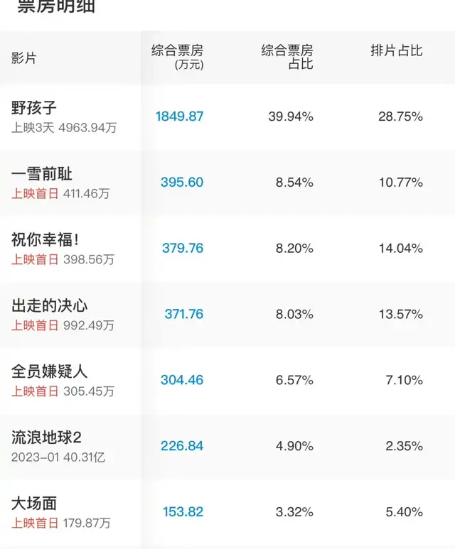《刺猬》的票房扑街,预测票房不超过1.5个亿。《野孩子》的票房排名暂列第一,但总体也表现一般。