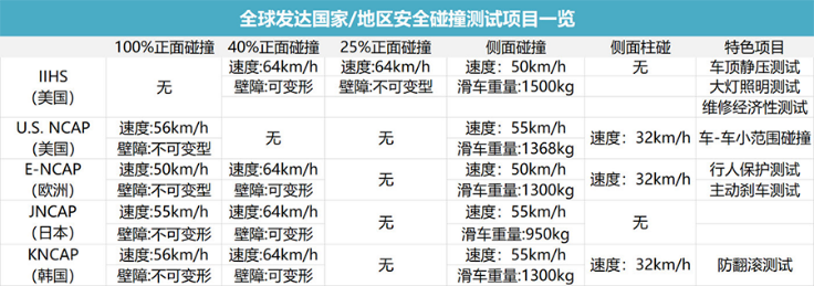 目前全球汽车安全碰撞测试机构有十几个,但是最有名的,最严格的只有2个,一个就是欧洲的E-NCAP,另一个就是美国的IIHS。大家可以看一下这个表格,IIHS的优势是它率先引入了25%小范围重叠碰撞测试,当年大众帕萨特A柱的事儿,就是因为这个25%偏执碰撞现出原形的。目前全球只有IIHS和咱们的中保研有这个碰撞测试项目。