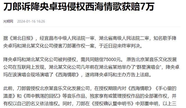 信息来源:光明网2021.1.16——刀郎诉降央卓玛侵权西海情歌获赔7万