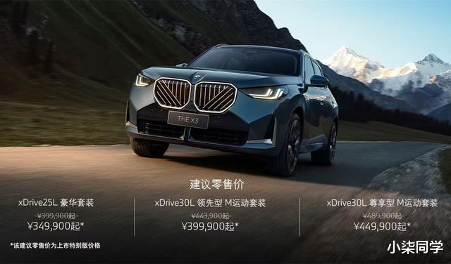 2025款全新一代国产加长版宝马X3提供3款配置车型,分别为:25L xDrive豪华套装、30L xDrive 领先型 M运动套装、30L xDrive 尊享型 M运动套装,售价34.99-44.99万元。