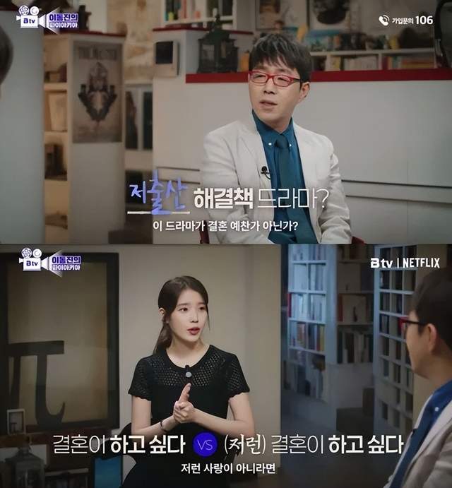 在节目中,李东镇表示:"最近韩国低生育率问题严重,但《苦尽柑来遇见你》这部剧简直就是在歌颂婚姻,看完后甚至会产生想生孩子的冲动。"对此IU坦言自己的态度是"一半一半",她解释道:"一方面会想要结婚,但如果不是剧中那样的爱情,可能就不会有结婚的欲望。我觉得这两种想法各占一半。"