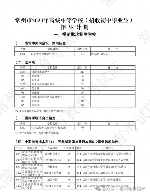 收藏!常州市2024年高级中等学校招生计划