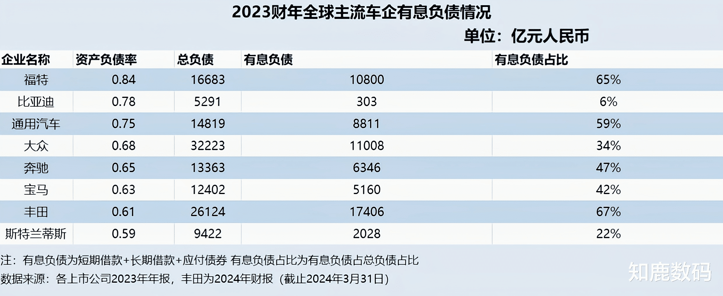 企业的总负债又包含有息负债和无息负债,还是以2023年为例,丰田的有息负债比为67%,大众集团为34%,福特为65%,吉利控股为24%,上汽为16%,长城汽车为17%,比亚迪为6%。