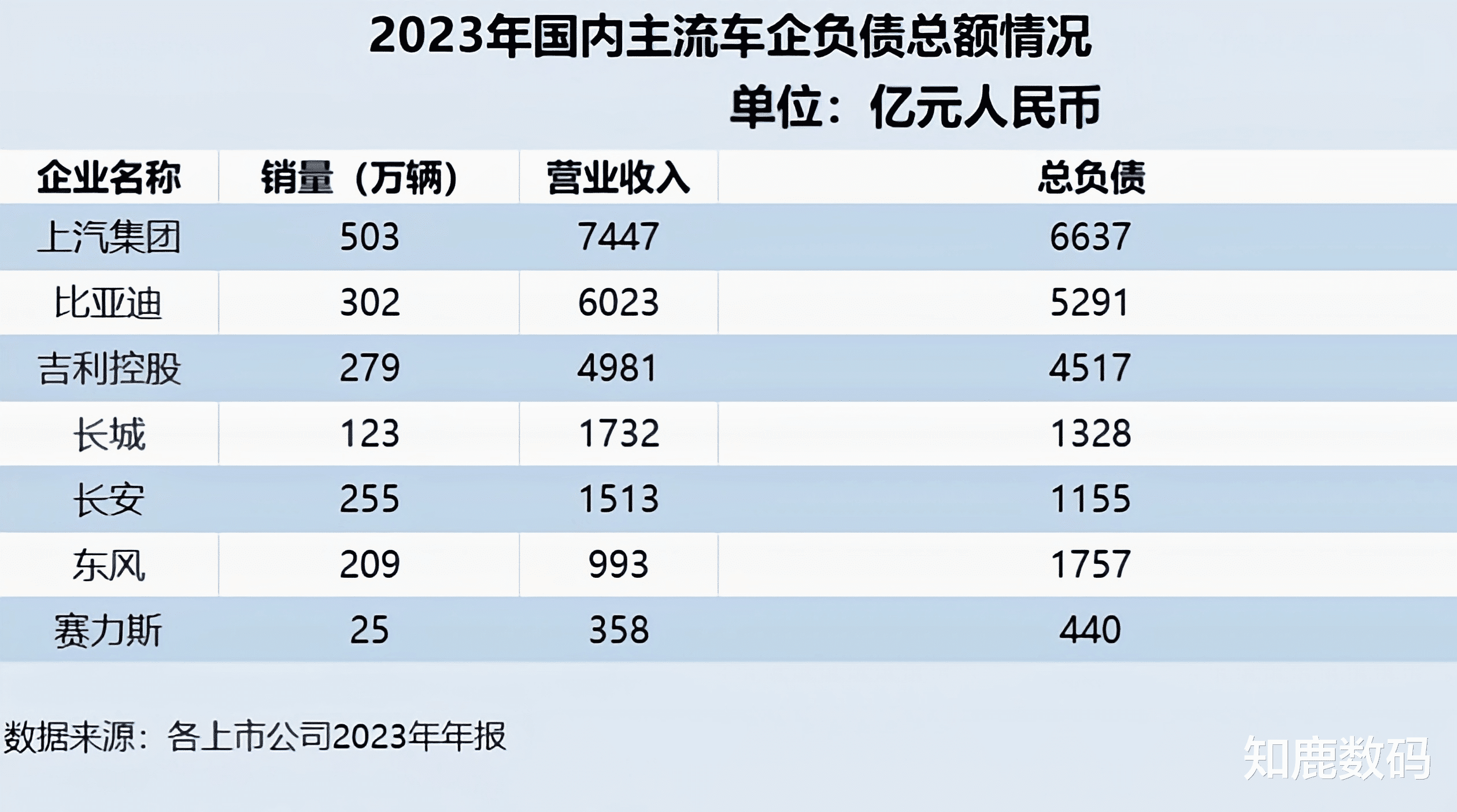 相比外企,国内车企的总负债相对要低一些,同样以2023年为例,上汽集团营收7447亿元,总负债6637亿元;比亚迪营收6023亿元,总负债5291亿元;吉利控股营收4981亿元,总负债4517亿元。