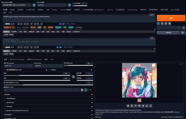 在加载好stable diffusion后,选用了一个动漫CG模型,然后在文生图下,用一些关键词生成了一张图, 512×512单张仅用时1.6s,出图的效率还是不错的。