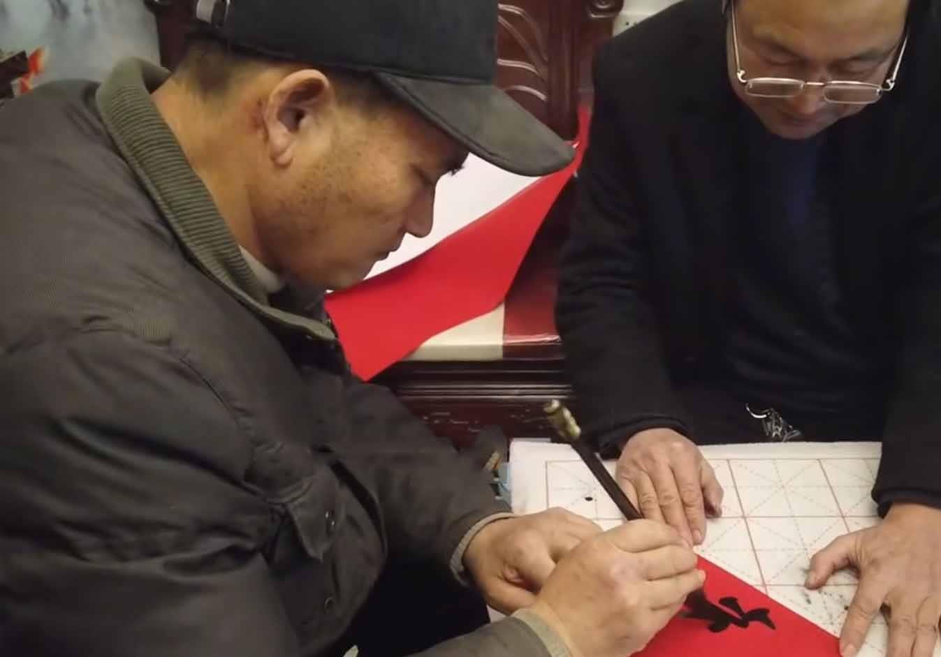 从他书写的状态上看,虽然书写的是非常认真的,但是字迹并不是太出色,书写的时候,还有一种陌生感,在书写“春”字的时候,三横的书写,小心翼翼,而且犹如硬笔书写的一样,虽然有些生硬,但是书写起来却是十分投入的,同时还注意了三横的长短对比,线条还是比较厚重的,想写扎实,但是实力上却不怎么允许,书法是文化人的事情,但是朱之文却非常推崇手写春联,看样子,传统文化对他的影响也是非常深远的。