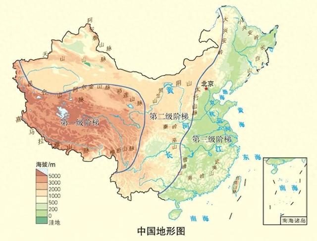第三阶梯:海拔均在5百米以下,地形以丘陵和平原为主。包括了三个平原:东北、华北、长江中下游平原。还有三个丘陵:东南、山东和辽东丘陵。再往东去,就延伸到海里,水深不超过200米的区域,为大陆架。