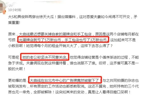 为此两人也是发生了争吵,显然具俊晔希望能够不计较眼前的得失,而大S则希望能够有个快速赚钱的渠道,而不是一直在亏损投资,要说起来不到十万新台币对于明星来说几乎是洒洒水,但大S如今却连这些亏损都放在心上,不难看出如今两人的财政状况并不好。