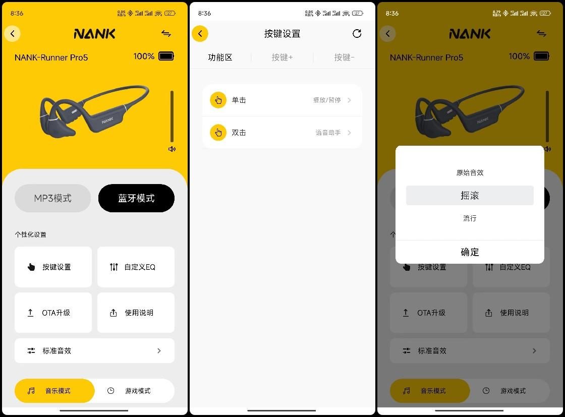 内置了32G的存储卡,将音乐拷贝至内置卡,跑步时即使脱离手机,也能畅享音乐。此外,这款耳机还支持APP功能,在手机端,可以查看电量,调节音量大小,切换蓝牙模式、MP3模式或游戏模式,更加直观方便。耳机还支持对三个按键的个性化设置,以及EQ和音效的自定义编辑,可以根据自己的喜好进行调整,大大提升了使用体验。
