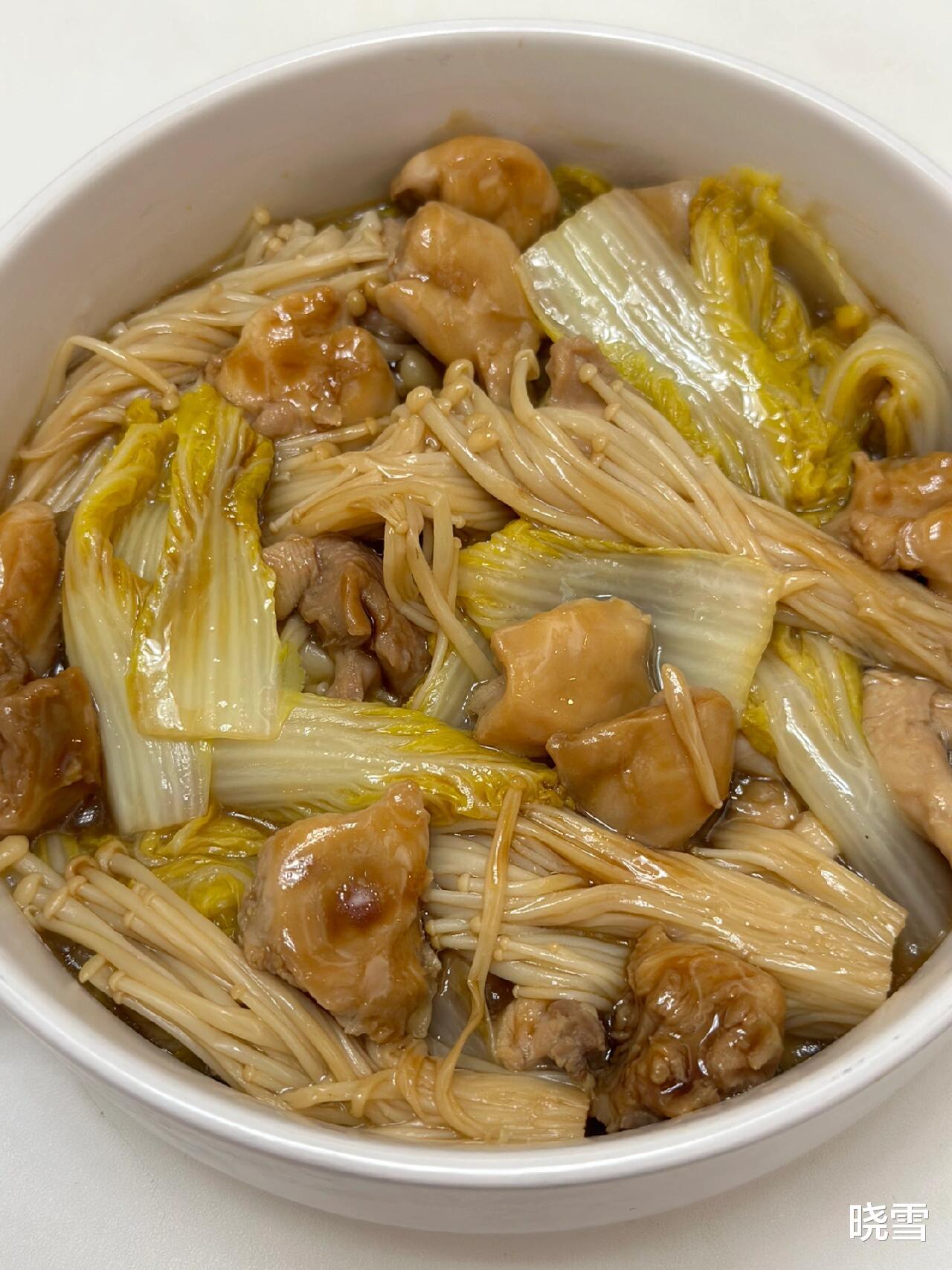 【食材】鸡腿、娃娃菜、金针菇、生抽、蚝油、料酒、香油、水。