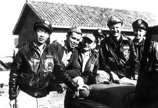 大卫-L-“德克斯”希尔(右二)与中美两国的战斗机和轰炸机飞行员在一起,他们刚从一次长程轰炸行动后返回