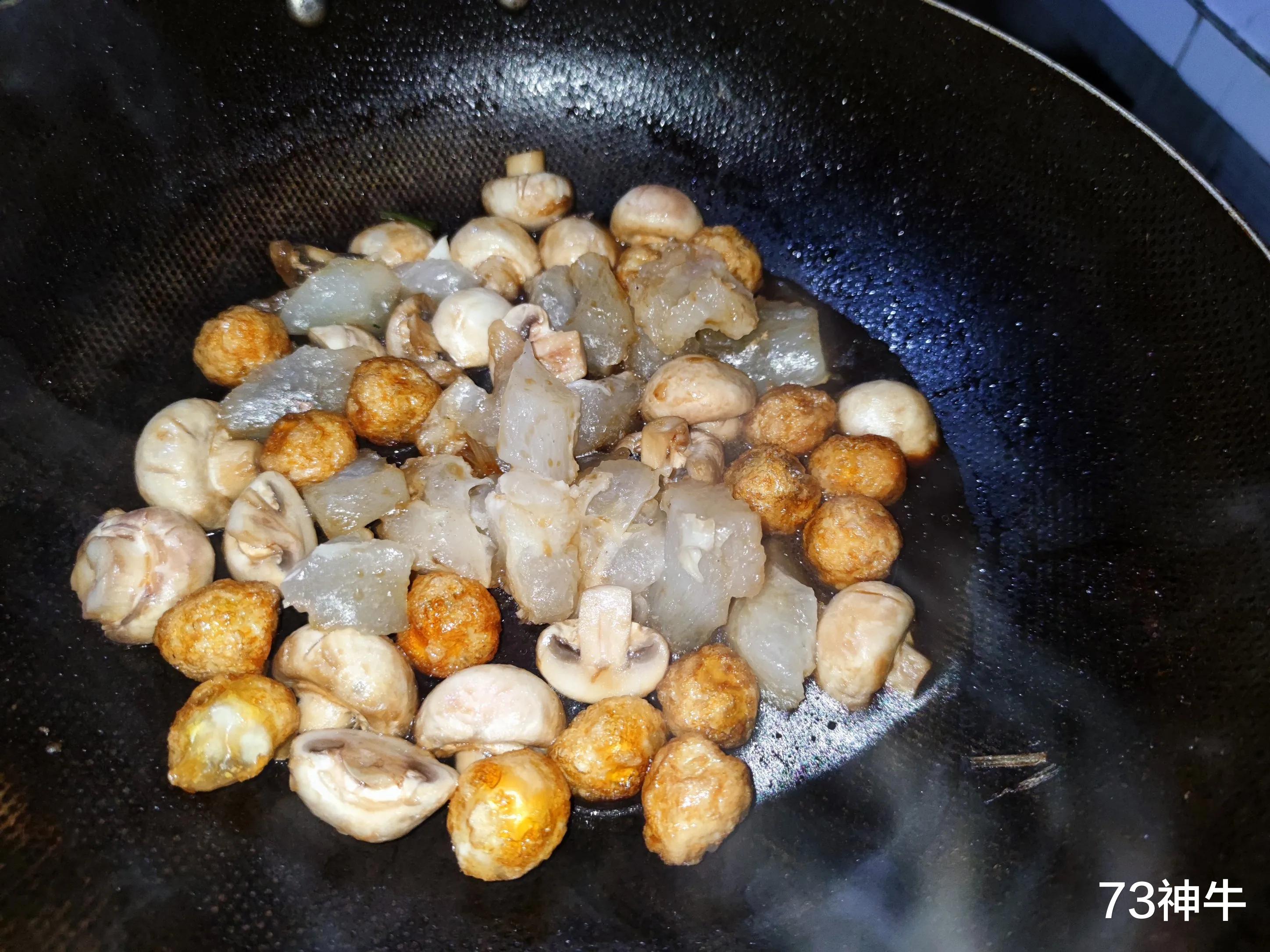 2.锅中入油爆香葱姜蒜,下入口蘑煎炒至表皮金黄起皱,下入蹄筋和鹌鹑蛋,烹入料酒、一品鲜酱油和蚝油后添汤,汤汁中加入少许白糖提鲜,烧至汤汁浓稠后加入盐和胡椒粉调味,淋入水淀粉勾个薄芡,滴几滴花椒油即可出锅享用。