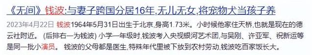 资料参考:2023-04-22搜狐娱乐——《无间》钱波:与妻子跨国分居16年,无儿无女,将宠物犬当孩子养