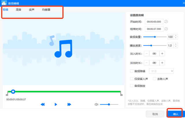 选中“音频编辑”还可对剪辑、混音、变声和均衡器这4大维度进行一定设置,包括常用到的播放速度、淡入淡出时长、音调音量、混音添加等多种参数。