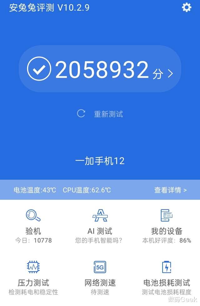 虽说兔兔的成绩只能参考,但是我还是给大家看看测试结果,一加12在目前室温28度的环境下进行测试,可以得到205万的分数,GeekBench6.2的单核、多核成绩分别为2280、6889,多说无益,直接原神!启动!