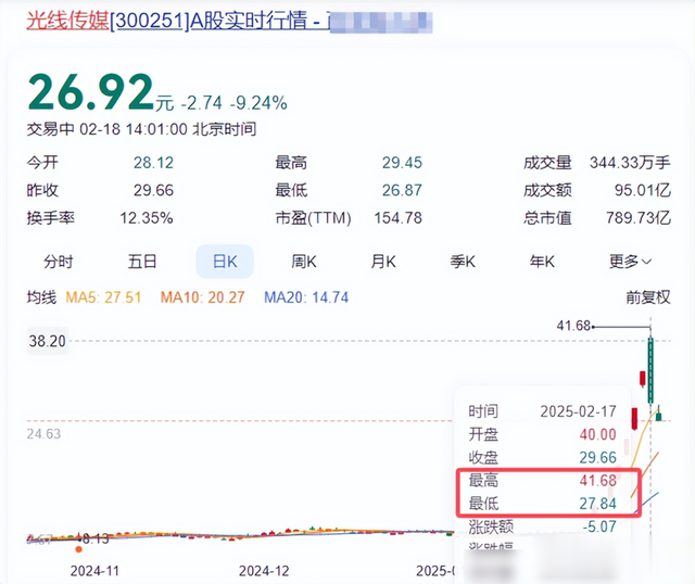 在2月14日,也就是情人节那天,一位影迷看到了自己心心念念的《哪吒2》终于票房大卖,回本了之后还收到了金手镯,没想到第二天光线传媒股价大跌,几天之内股价却疯狂波动, 从2月14日的26.3元一股,短短两天就已经涨到了35.1元,之后又在短短的几小时内暴跌40.04%,一度跌到21.21元,短时间就蒸发了超过300亿的市值。