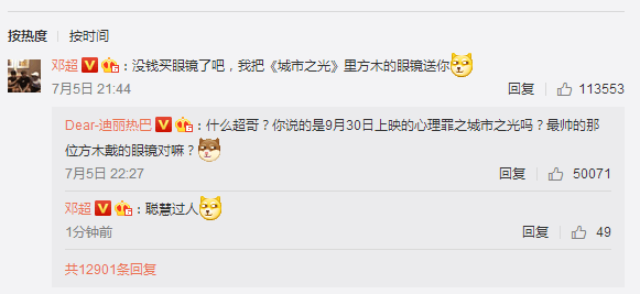 我们的迪丽热巴童鞋,也比较上道呀,还回复超哥:什么超哥?你说的是9月30号上映的心理罪之城市之光吗?最帅的那位方木戴的眼镜对吗?邓超用了聪慧过人来形容热巴,你套路,我腰都不扶,就服你俩呀!