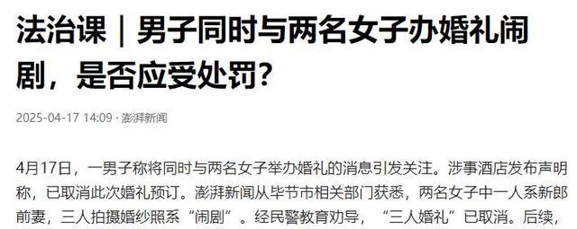 2025-04-17 14:09 澎湃新闻 法治课|男子同时与两名女子办婚礼闹剧,是否应受处罚?